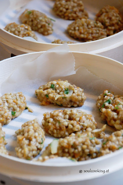So kam ich auf Buchweizennockerl (Buchweizen anrösten bis er durftet, etwas geraspelte Karotte, Kohlrabi, Kräuter, 1 Ei) in einer Gemüsekraftsuppe (Gemüse, gerösteter Fenchel, Paradeiser, etwas Fu Ling mitgekocht, Safran und geröstete Gewürze und frische Kräuter ca. 1-2 Stunden köcheln lassen).