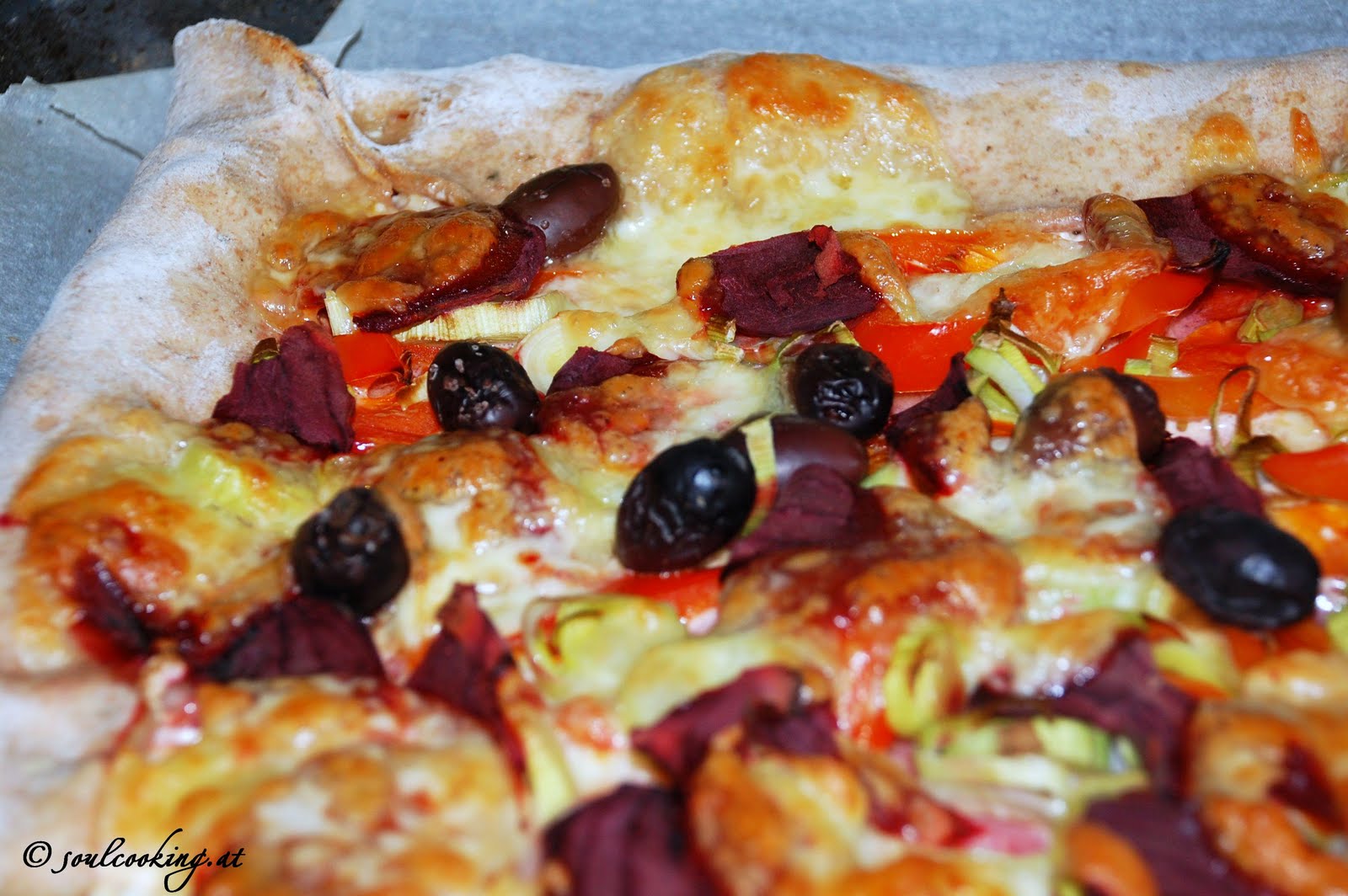 Die Ränder standen über das Backblech.. abschneiden wollte ich sie nicht also hab ich sie kurzerhand mit Schafkäse und Paradeierstücken gefüllt. Danach belegt (Lauch, rote Rüben, Paprika, Oliven und Mozarella) und ab ins Rohr für gute 20 Minuten. Schönen Feiertag!