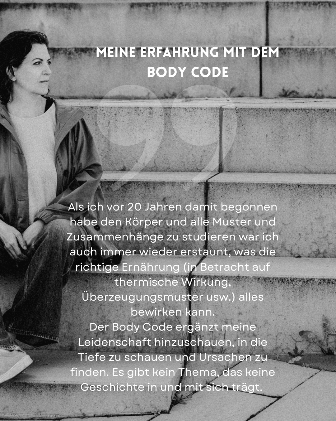 Der Body Code ergänzt meine Leidenschaft hinzuschauen, in die Tiefe zu schauen und Ursachen zu finden. Es gibt kein Thema, das keine Geschichte in und mit sich trägt.