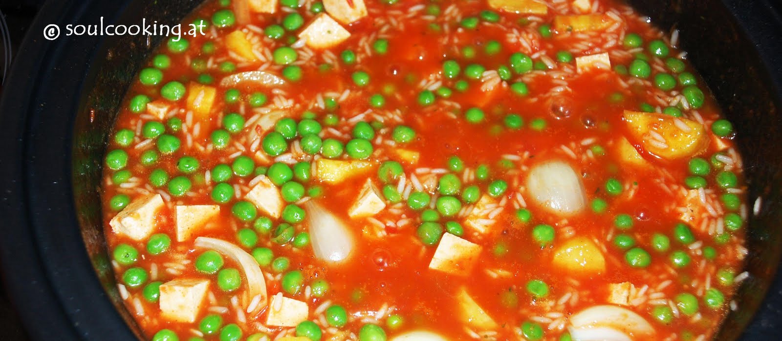 Reis, Erbsen, Zwiebel, Karotten, Tomaten (enthäutet und püriert) und Tofu und natürlich viiiele Kräuter und ein paar Gewürze
