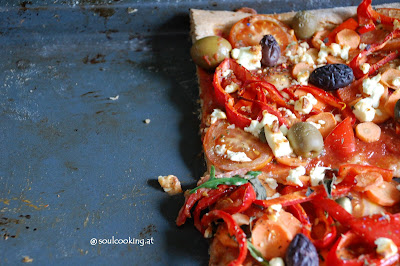 Und daraus wurde eine wunderbare Gemüsepizza mit Oliven, vielen Kräutern, Schafkäse und Rucola, und welch Wunder ein Backblech reichte gerade für uns 4 🙂