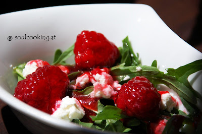 Ruccolasalat (der im Garten wuuuchert - ich liebe ihn :-)) mit Himbeeren und Schafkäse und ein Dinkel-Gemüsestrudel mit Buchweizen und Seidentofu