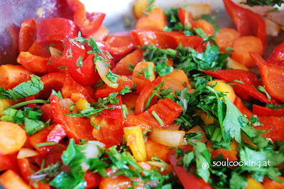 Paprika, Karotten, etwas Fenchel, etwas Zwiebel, Salz, Galgant und Kräuter